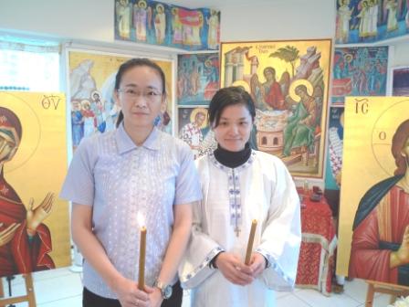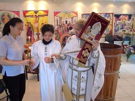 Angel has just been baptised and chrismated with the Holy Chrism (oil) and put on the cross and symbolic garments of Christ. The procession is led with the priest in the role of Christ, with the newly-baptised Angel and her sponsor Pelagia.