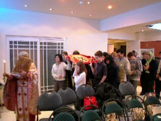 This year Father Jonah was able to do all the services of Holy Week, and everyone in attendance had access to the texts in English and Greek, with the more familiar texts also in Chinese and Church Slavonic (the Internet is a great resource). While numbers were low (four to six) on Monday, Tuesday, Wednesday, Thursday morning, numbers increased for the Reading of the Twelve Gospels on Thursday evening, Good Friday Vespers and Lamentations, and Saturday morning Liturgy, swelling to well over 50 for the Resurrection Liturgy on Saturday evening.