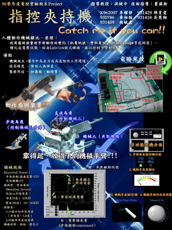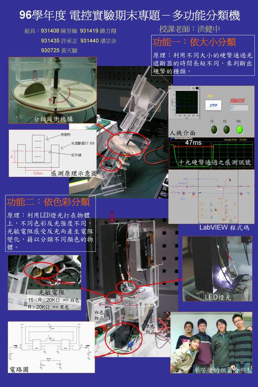 大四修課學生整合虛擬儀控、機構、電路設計、感測器、程式設計及人機界面等知識, 完成"多功能分類機"及"指控夾持機", 並製作大型海報進行成果展示。