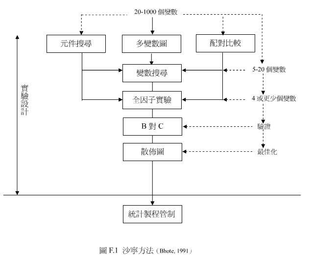 Dorian Shainin於1950年首次發表沙寧方法,此法係根據他多年來的顧問工作案例所累積之經驗整理而成。沙寧方法為一些統計技巧的組合,它包含多變數圖(multi-vari charts)、元件搜尋(components search)、配對比較(paired comparisons)、變數搜尋(variables search)、全因子實驗(full factorials)、改善前後方法之比較(B vs. C test)及散佈圖(scatter plots)等七種工具。透過變數之縮減,沙寧方法是用來解決長期性的品質問題,如圖F.1所示。沙寧法的基本哲學:「不要讓工程師們做一些猜測的事,讓零件說話!」沙寧方法的七種工具的目的、使用時機和適用樣本數如表F.1所示。