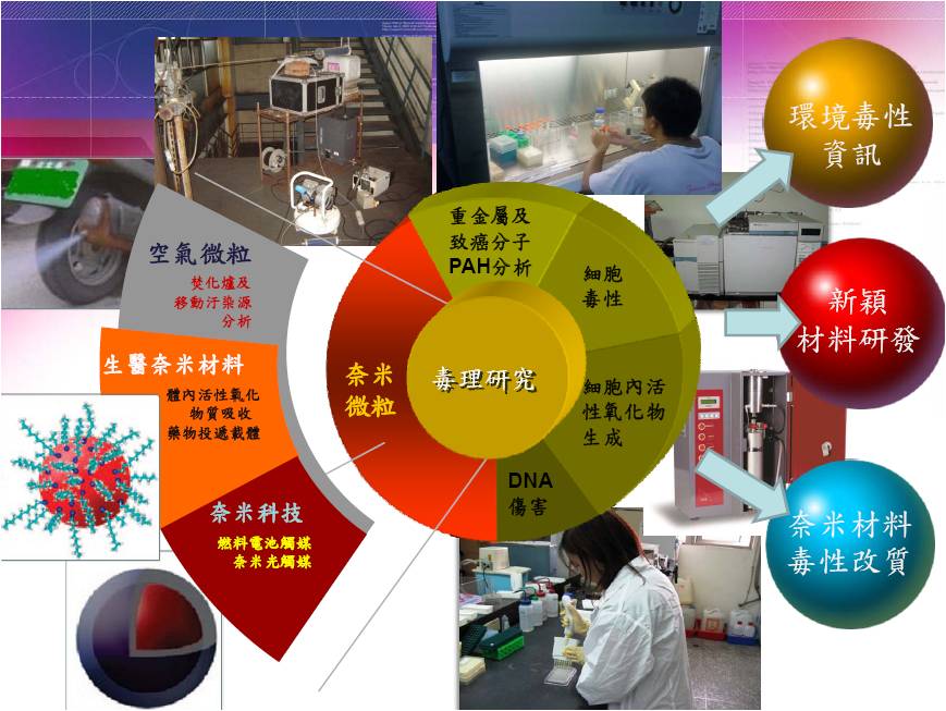 主要研究分析技術為應用X光吸收光譜儀(X-Ray absorption spectroscopy (EXAFS 、 XANES))、紅外線光譜儀(FTIR)、電子顯微鏡 (SEM) 、 X- 光繞射分析儀 (XRD) 、氣相層析質譜儀 (GC-MS) 、原子力顯微鏡 (AFM)、光學鉗(OT)、 螢光顯微鏡(FM)等設備。 |