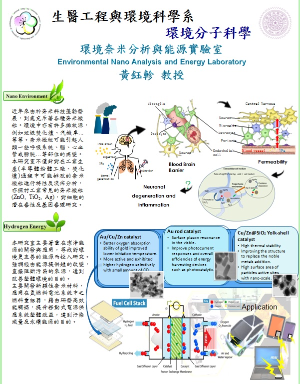 傳統的空氣污染控制設備難以去除奈米顆粒,而這些奈米顆粒若被釋放到環境中,對人類環境及健康的衝擊將扮演很重要的角色。另外由於地球資源日益枯竭,若能尋求更潔淨且高效率的替代能源,減少對石油的依賴,才能達到優質環境的目的。故本實驗室目前的研究方向如下: